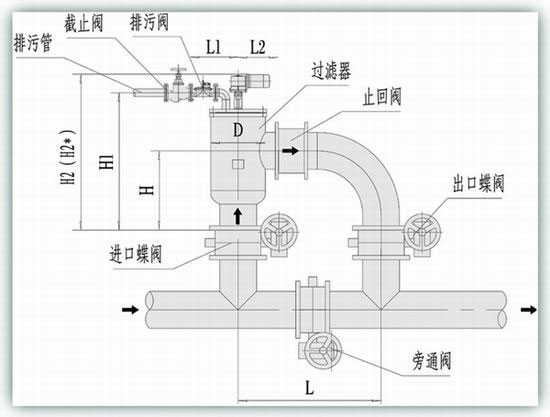 型號(hào) 管徑 (mm) 過(guò)濾 流量 (m3/h) 過(guò)濾 面積 (cm2) 排污 閥DN (mm) 一次清 洗水量 (L) 電機(jī) 功率 (KW) 重量 (Kg) D (mm) H (mm) H1 (mm) H2 (mm) H2 (mm) L1 (mm) L2 (mm) L (mm)
