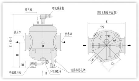 型號(hào) 管徑 mm 過(guò)濾 流量 m3/h 過(guò)濾面積 cm2 電磁排污閥DN1 mm 一次清洗水量L 清洗排污閥DN1 mm 電機(jī)功率 KW 重量 Kg D mm H mm H1 mm H1 mm H2 mm E mm D1 mm B mm C mm C1 mm D mm